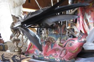 Ein Ausschnitt aus unserem schamanischen Altar: Hier blicken Sie vom Krokodilsgeist Richtung Traumfetische.