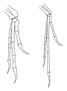 Vergleich des Handskeletts: Links der Maniraptor Deinonychus, rechts: Archaeopteryx (verschiedene Maßstäbe)