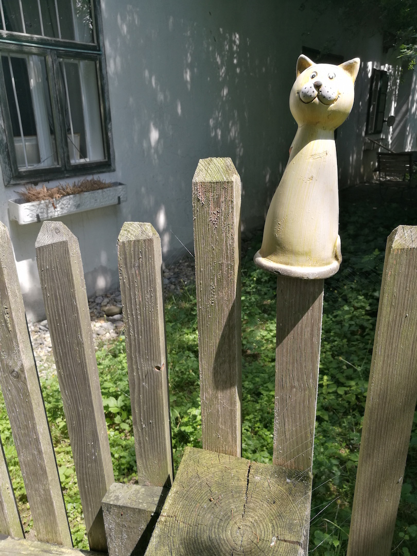 Der Hund hat sich im Übrigen, wie von mir ganz klar vorhergesagt, nicht mehr aus seiner Hundehütte herausgewagt, seit er eine Zeitlang darin festsass. Jetzt bewacht er sie Tag und Nacht, damit ihm etwas derartiges nicht noch einmal passiert. Ich glaube, er wird nicht einmal auf das jetzt hier folgende recht provokante Bild einer auf seinem Zaun sitzenden grinsenden Katze reagieren, weil er mit seinem Wachdienst für die eigene Hütte noch viel zu beschäftigt ist. Sie werden schon sehen, der Hund rührt kein Ohrwaschl.