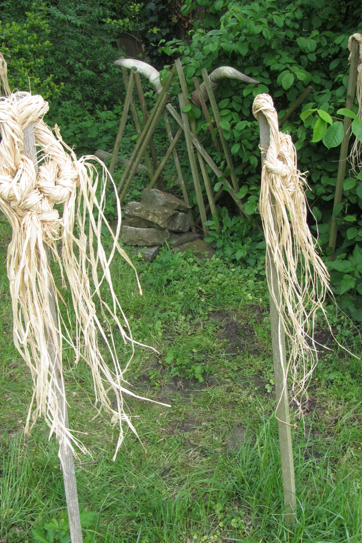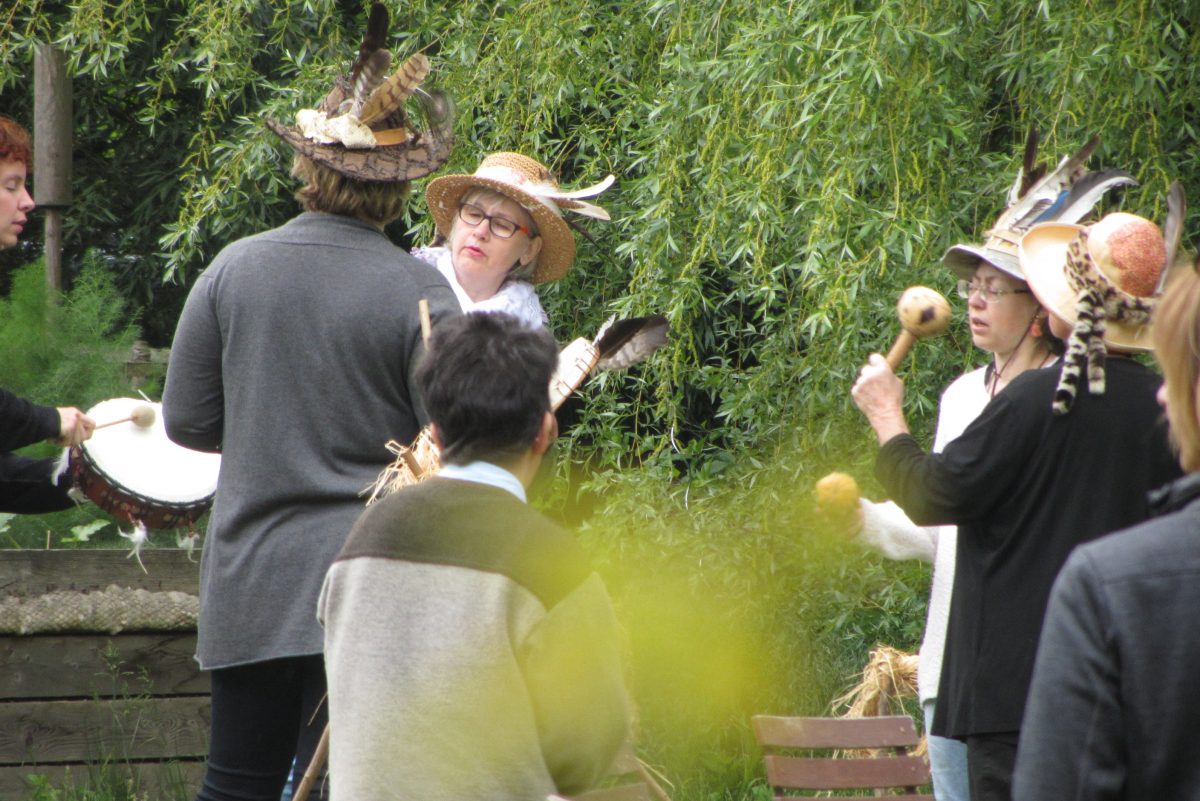 Kein Wunder, wenn sich die Schamaninnen zu einem Wettergesang und Tanz direkt vor den Regenmännern und Sonnenfrauen trafen, welche wir als schamanische Installation auf unsere große Wiese gestellt hatten…