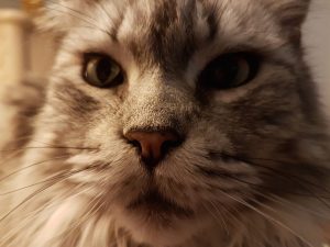 Da stellt sich das riesenhafte Tier einfach unvermutet hinter mir auf, und lässt dann mit einem Mal ein Zwischending zwischen einem ungeheuren Katzenniesanfall und einem durchdringenden Katzenhustengeräusch vernehmen, in welchem ich auch Untertöne boshaften Lachens zu finden meine.