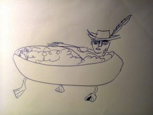 Hier sehen Sie den Schamanen in seiner Entenfußbadewanne, völlig unsichtbar für jeden Kater. Um die magische Wirkung des Rituals noch zu erhöhen, hat er auf anmutige Weise sogar seinen Schamanenhut während des Bades auf seinem Kopfe platziert.