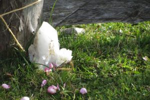 Schließlich ereilte aber auch den restlichen Stamm sein natürliches Schicksal, und wieder fiel er genau in die richtige Richtung, und zwar diesmal in die jener Richtung, in welche der Großteil des Baumes ein oder zwei Jahre zuvor gefallen war, entgegengesetzte, und so ist der umgestürzte Rest des Baumstamms seitdem Teil einer meiner schamanischen Installationen geworden, in die er sich freundlicher Weise einfach nahtlos eingefügt hat.